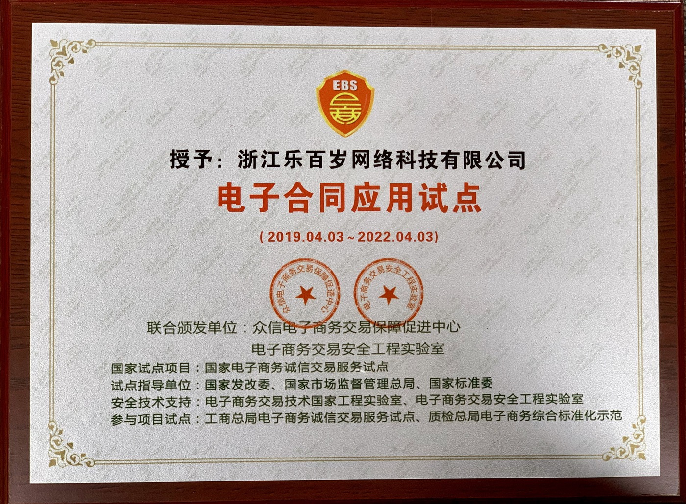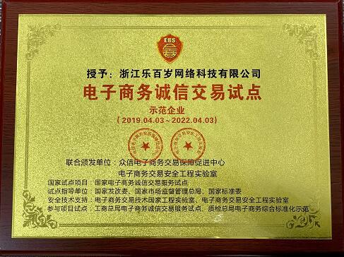 2019年4月,浙江樂(lè)百歲在經(jīng)過(guò)國(guó)家市場(chǎng)監(jiān)督管理總局,國(guó)家標(biāo)準(zhǔn)化管理委員會(huì),國(guó)家發(fā)展和改革委員會(huì)等九大國(guó)家數(shù)據(jù)庫(kù)的嚴(yán)格交互審核,成為國(guó)家發(fā)改委“電子商務(wù)誠(chéng)信交易服務(wù)試點(diǎn)”、國(guó)家標(biāo)準(zhǔn)委“電子商務(wù)綜合標(biāo)準(zhǔn)化示范”、國(guó)家市場(chǎng)監(jiān)管總局“電子合同標(biāo)準(zhǔn)研制與應(yīng)用試點(diǎn)”。